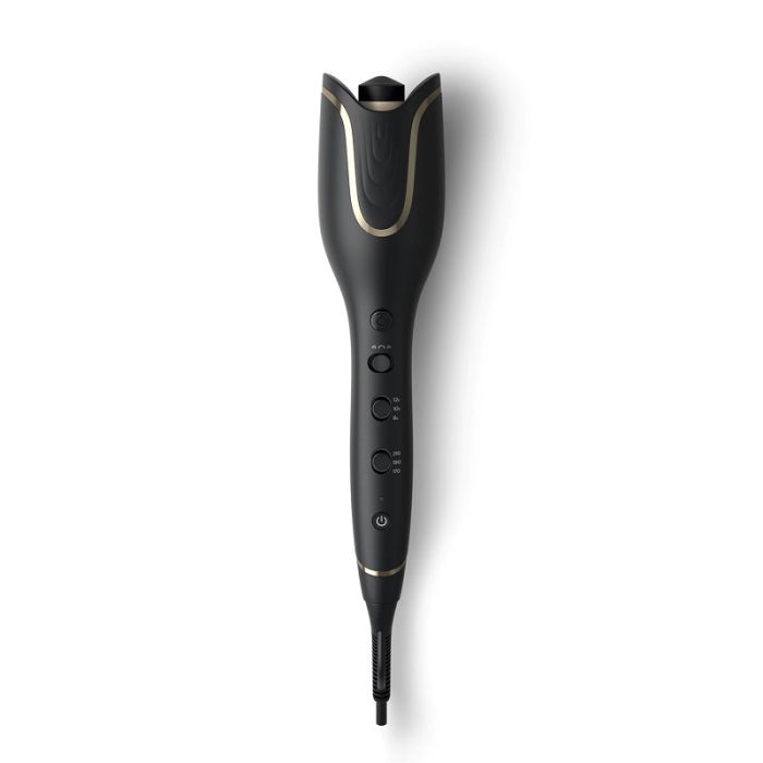 Enjoy ultimate styling experience with the smart curling system. The innovative system is a great package of many upgraded features. Fabulous, lasting curls are created at a touch of a button with two auto-rotating smart curl guards. They curl every hair strand like a professional stylist all the while caring for your hair. The clever curl boost technology allows the auto curler to create lasting results at a more caring temperature setting. The device's longer barrel, easy vertical grip and open design that follows the natural flow of your hair help you style perfectly with little effort. - Vertical grip for easy use